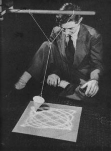 Carefully observing the character of the lines present in each side of this painting, one might surmise that they were produced in two ways. The right side features no regular pattern, no rhythm or cyclical quality in the peregrinations: It appears to have been poured pretty much as Ernst described in his memoirs — by holding a can on a string and simply swinging it with his hand over the canvas on the floor. On the left side, there is an order, an evident periodicity that suggests a Lissajous figure, also known as a Bowditch curve. Lissajous figures can be graphically reproduced with a compound pendulum. Compare the structure of the linear figure on the left in La Planète Affolée with the figure in this photograph: