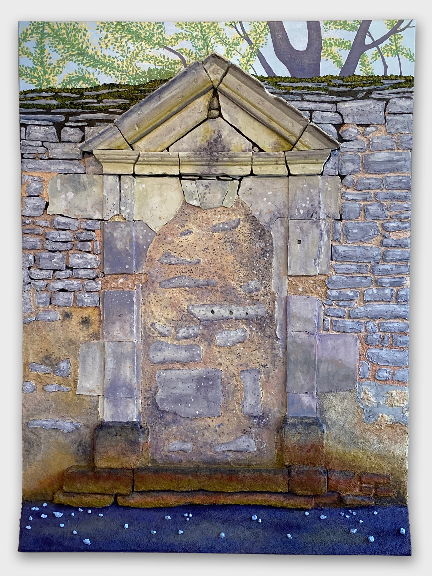 The work is based on a ruin in the village of Étais, in Burgundy, not far away from my studio. Judging from the style of the remnants, it was a late sixteenth-century shrine, probably holding a statue of the Madonna and Child. It’s right on the road, visible to all passers-by. The village is on the old road to Santiago de Compostela, a destination which is hundreds of kilometres from here. Pilgrims from the north sometimes, as an expression of devotion, walked all the way. This was most likely a donation, commissioned by the owner of the Château d’Étais, which is no longer standing, for the benefit of those pilgrims on their journey. I can only guess, but it’s probable that it was wrecked during the French Revolution, then walled up with detritus and junk, no longer sanctified.