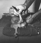 I managed to overcome my reluctance to convince anyone else of the merits of my project quickly enough to find a veterinarian right in Denton. He was a regular dog-and-cat vet who of course had some experience with other critters, and he, not surprisingly, was also an Aggie. He was willing to be the anaesthetist for a very reasonable fee. Really, he was interested in the idea enough to charge only for his expenses. But he didn’t want to lose his “regular guy” reputation, so he asked to remain anonymous. I understood. He still had a practice to protect (!) I coordinated the tattoo event among all the participants, who were by then: Randy Adams and his assistant, the vet, two photographers (Bob Wade and Burt Finger), a video person, myself, and, of course, Minnesota. We all met on Sunday, November 21, 1976, at the veterinarian’s office.