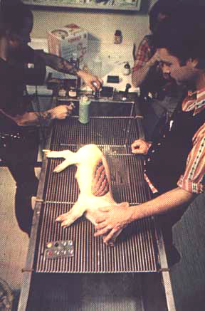 Indeed, finding pigs was no problem. Finding both a tattooist and a veterinarian willing to facilitate the project was another thing altogether. Previously in Houston I had made the rounds to a couple of the old tattoo parlors. In those days they were pretty moth-eaten and cheesey, so I was a bit put off by the general ambience of them to begin with. When I made my pitch, in the most generous and positive terms I could muster, I was told, after a guffaw of disbelief, “NO!” Tattooists were defensive about a lot of things back then, and I think I offended one guy’s sensibilities as an artiste by lowering his art form to the barnyard. Another tattooist was worried about getting busted by the health department if word got around that he was tattooing pigs in his shop. I understood that, because tattooing was potentially a hazard for the proliferation of disease, hepatitis in particular, and in some parts of the world, tattoo shops were illegal for that very reason. The obvious remedy to all this is, of course, a vigorous sanitation regimen, including the use of an autoclave.